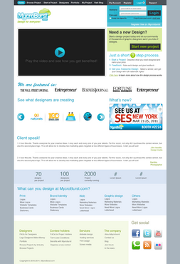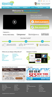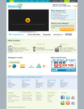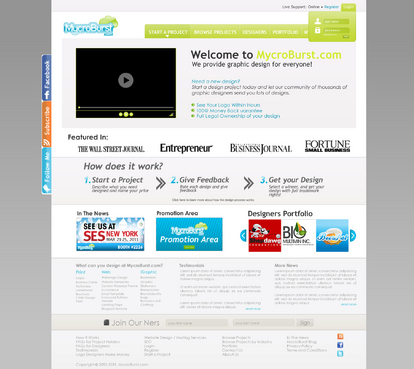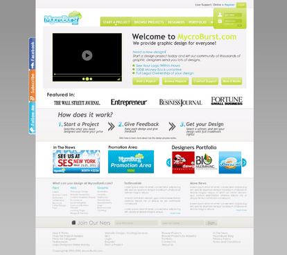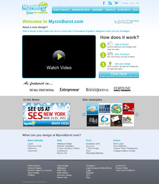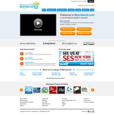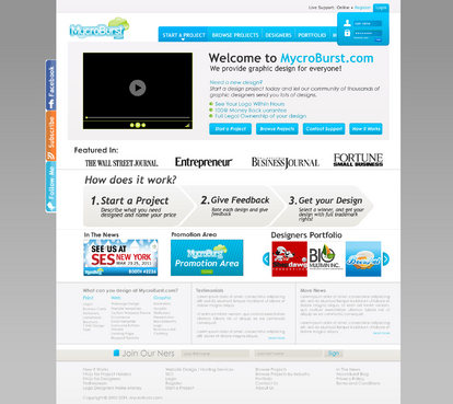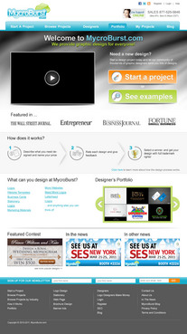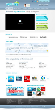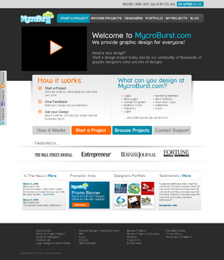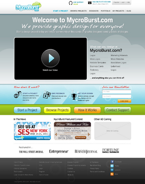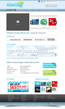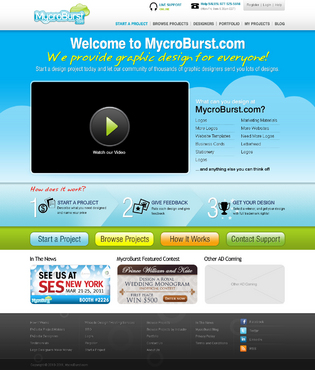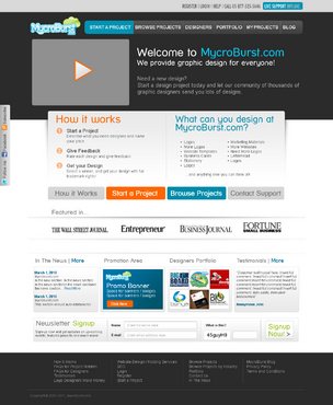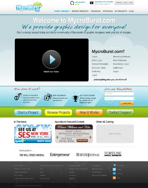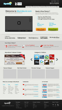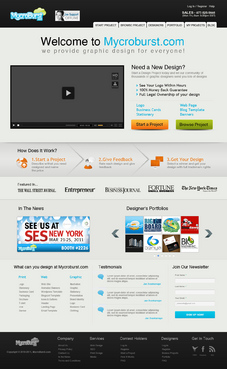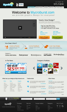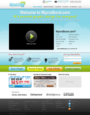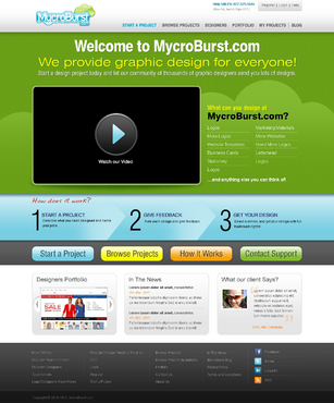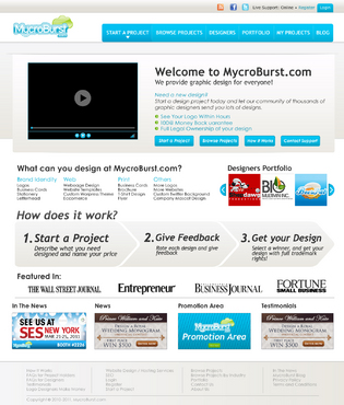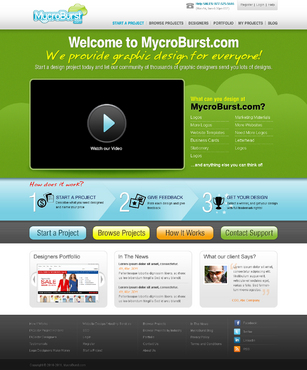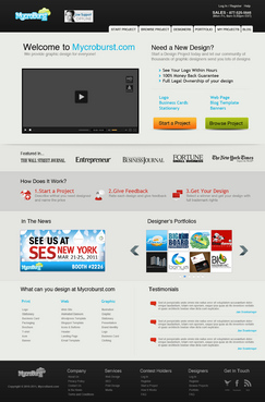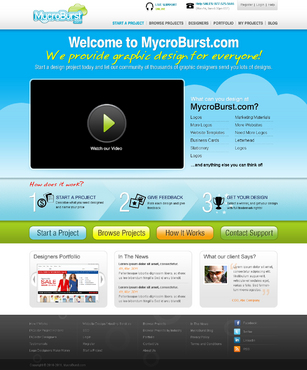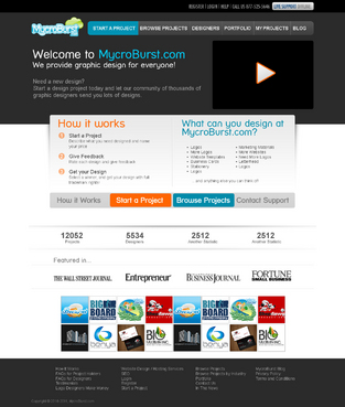 We want you to be creative! Show us how talented you are! We are open to using any colors as long as the MycroBurst logo looks like it belongs on the page. There will be a Video on the website. Leave a Rectangle-shaped space available for the video to be placed, near the top of the page. The website needs to contain the following Text: (Large Title) - Welcome to MycroBurst.com (Smaller subtitle) - We provide graphic design for everyone! Need a new design? Start a design project today and let our community of thousands of graphic designers send you lots of designs. How does it work? 1. Start a Project - Describe what you need designed and name your price 2. Give Feedback - Rate each design and give feedback 3. Get your Design - Select a winner, and get your design with full trademark rights! Click here to learn more about how the design process works. What can you design at MycroBurst.com? Logos More Logos Website Templates Business Cards Stationery Logos Marketing Materials More Websites Need More Logos Letterhead Logos …and anything else you can think of! (We will need an area, like a Bar across the page, or down the side, to show statistics:) # of Projects # of Designers #Another Statistic # Another Statistic (Large Buttons we will need): Start a Project Browse Projects How It Works Contact Support (We will also need to have an area to have these links:) How It Works FAQs for Project Holders FAQs for Designers Testimonials Logo Designers Make Money Website Design / Hosting Services SEO Login Register Start a Project Browse Projects Browse Projects by Industry Portfolio Contact Us About Us In The News MycroBurst Blog Privacy Policy Terms and Conditions
