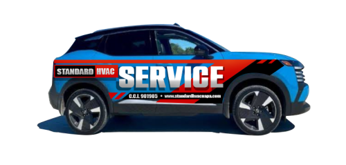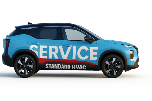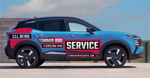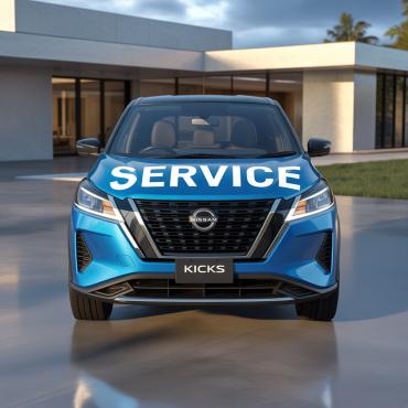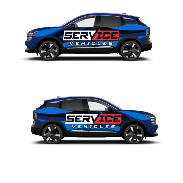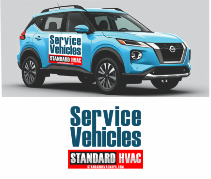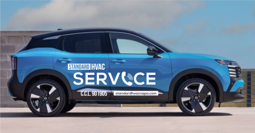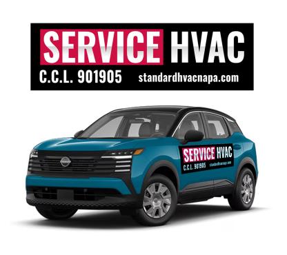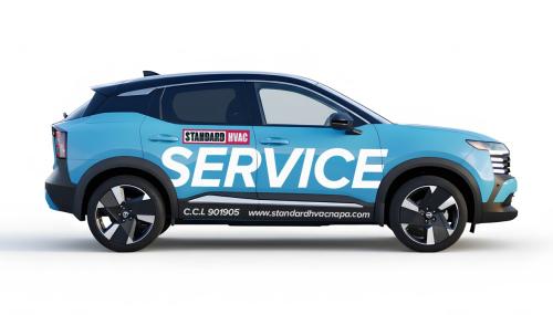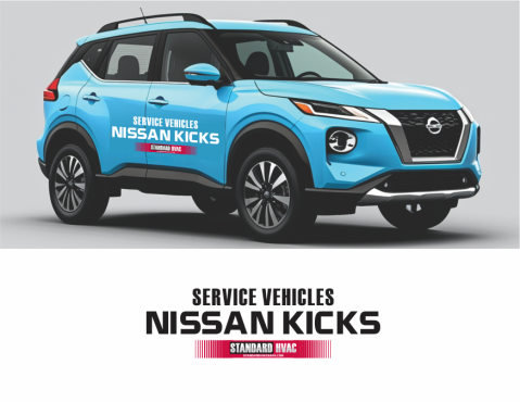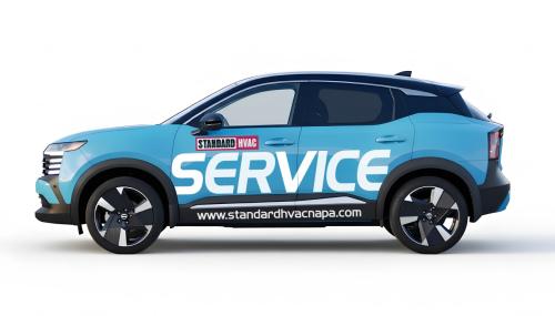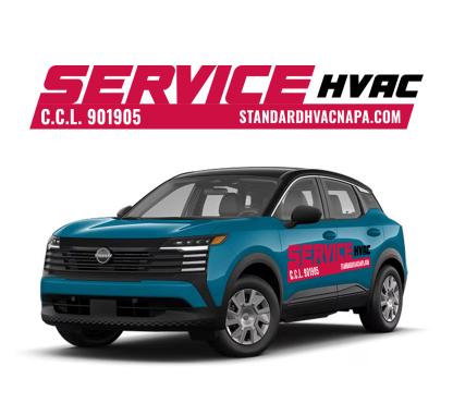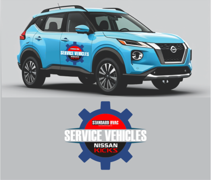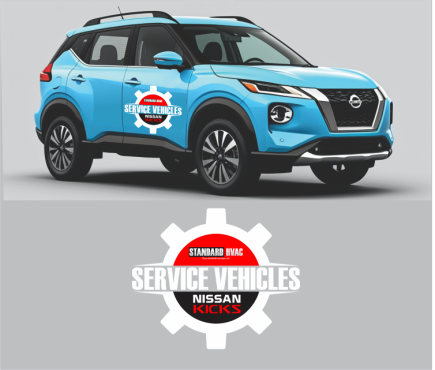 We are looking at light blue 2025 Nissan Kicks as our fleet for very high end modern and bold service vehicles. Large blocks Text or something completely iconic and creative. Needs to incorporate our existing image and logo in some way … but needs to READ “ Service” as the primary function. Www.standardhvacnapa.com for reference.