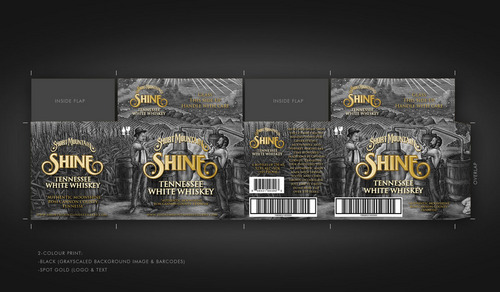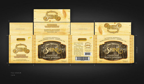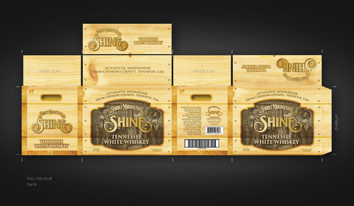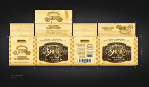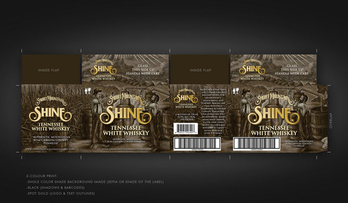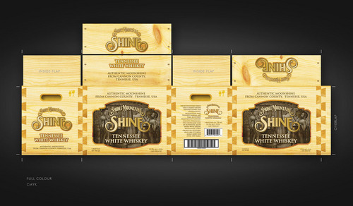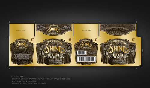 A box template is included with visual detailed instructions. Our logo is the most important image on the box. We have also included a copy of our bottle label and the artistic images related to the product. These images are yours to play with. Elements of the images can be used to craft the final image. The list of images included in this project are: 1) box template with detailed instuctions 2) Our Logo 3) Short Mountain Shine's bottle label which contains the following key peaces of information and their font "Short Mountain Shine", "Tennessee White Whiskey". 4) A graphic of a moon coin on our bottle (not mandatory) 5) A high resolution woodcut drawing that blows up nicely to create a variety of moonshine/farm related graphics. (not mandatory but makes a great background) The files have been attached. This MUST BE produced in CMYK using only THREE COLORS. It must be in 600 dpi+ for print and will be printed on a base white RSC box. The white base can be used as a fourth color option.