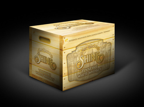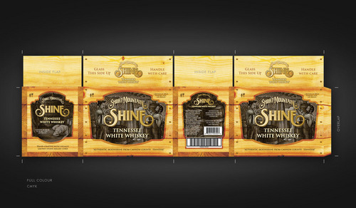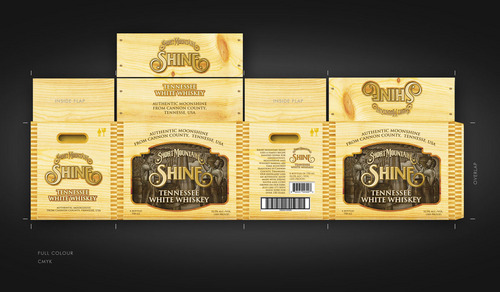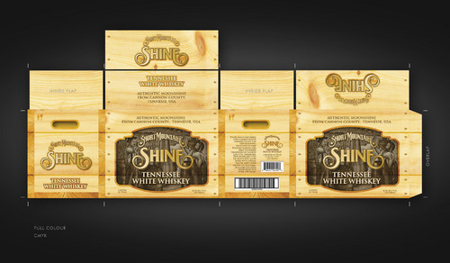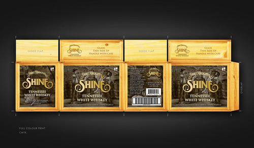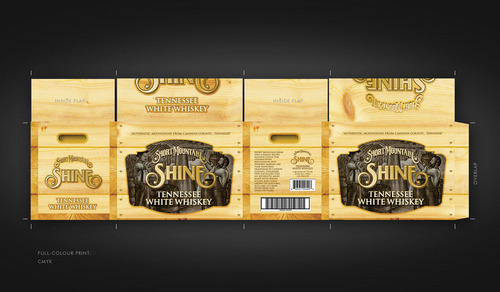 This is the cardboard box that we will use to ship 6 bottles of our premium moonshine to suppliers. The box will be used as a display piece as well as a shipper. Designers should consider what the the final design looks like as a stacked display as well as a stand alone display.