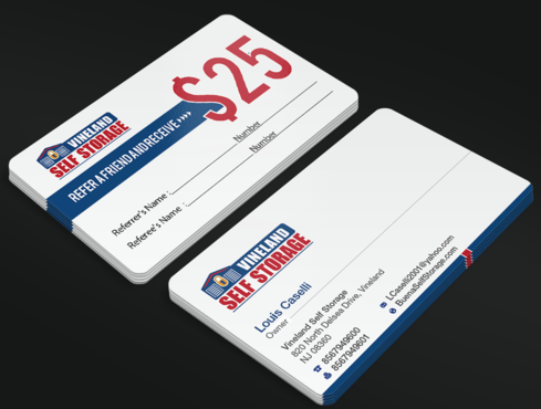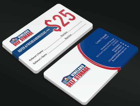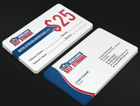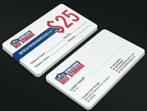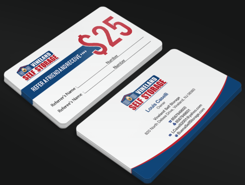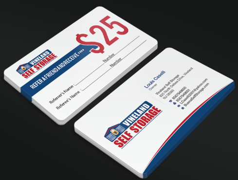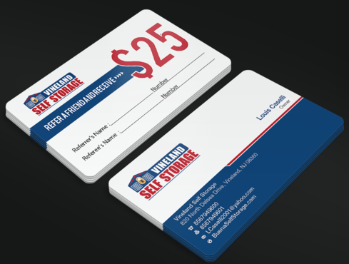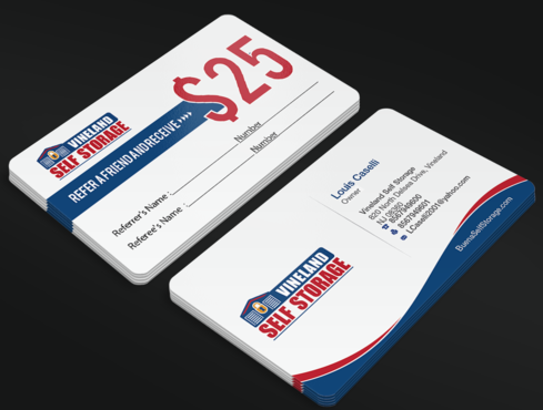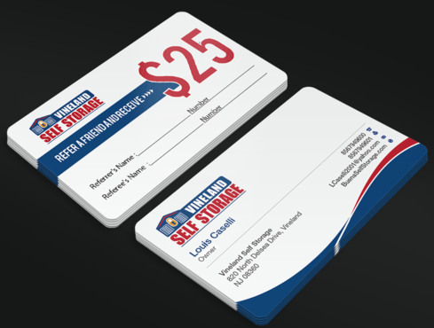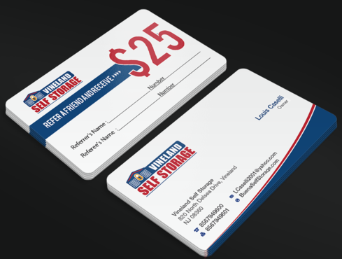 Premium Style business cards for each of the 2 Owners and Standard Referral Business cards for each location Vineland, South Vineland and Buena. Owner Louis Caselli only wants information regarding Vineland location on his Personnel Premium Business card. LCaselli2001@yahoo.com Owner John Caselli only wants information regarding Buena location on his Personnel Premium Business card. JCaselli2001@yahoo.com Phone Numbers: Vineland- 8567949600 Fax 8567949601 South Vineland- 8567949100 Fax (856) 6961004 Buena- 8567949100 Fax (856) 697-1161 website: BuenaSelfStorage.com