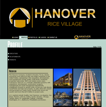 The Hanover Company is rebranding the naming of its apartment projects. We are moving closer to an industry norm which is use a company's name followed by the location. Our projects we build are from coast to coast and are class A projects. They range from garden projects to 48 story highrises from Boston to Los Angeles. Our goal in this is to develop a new logo that we can use on our marketing collateral, signs and website. Below is a link to our website that will give you a sense for the type of projects that we build.