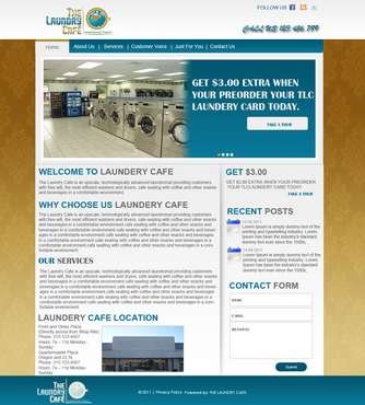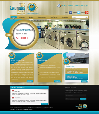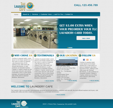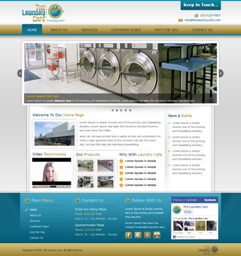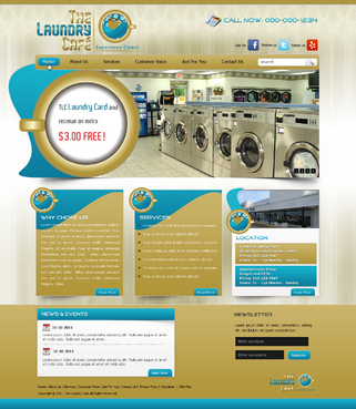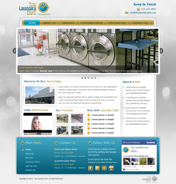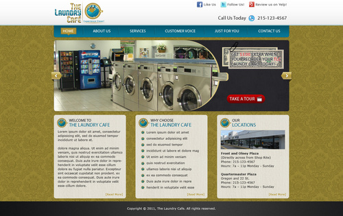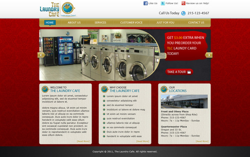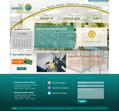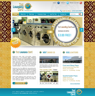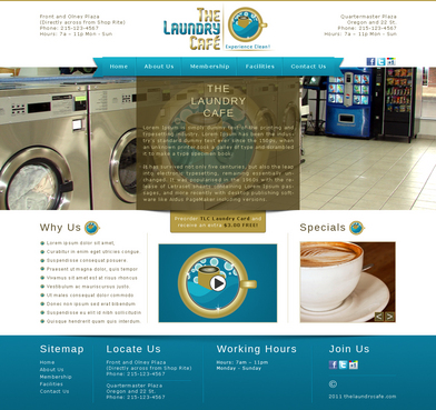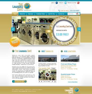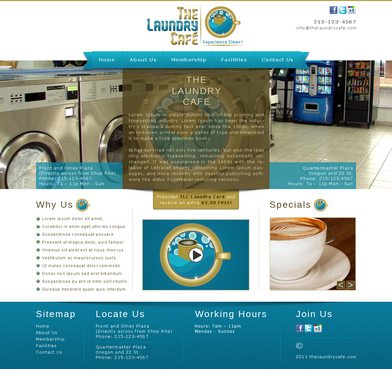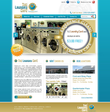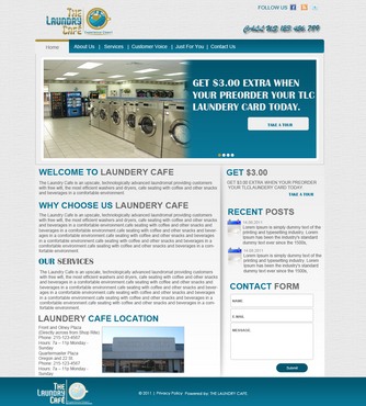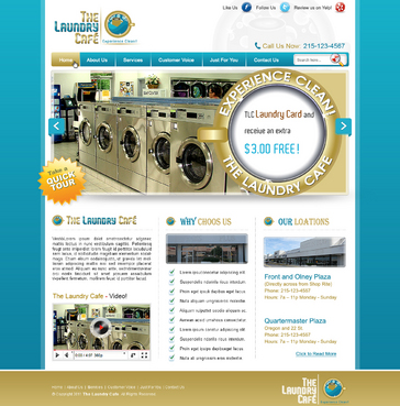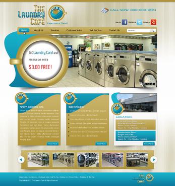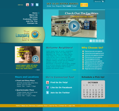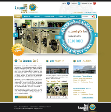 While most customers are women, the site should not be overly femine, so that both sexes will feel that the site is made for them. Main sections: header, nav (Home, About Us, Services, Customer Voice, Just For You, Contact Us), main content and side bar for highlights. The site will include video testimonials from customers and photos. We want customers to be able to take a tour through the store. We are trying to engage customers to Preorder their TLC Laundry Card and receive an extra $3.00 FREE! We are asking customers to "Like Us" on facebook, follow us on twitter and review us on yelp!. Using the associated icons. The design should reflect two locations. Front and Olney Plaza (Directly across from Shop Rite) Phone: 215-123-4567 Hours: 7a – 11p Monday - Sunday Quartermaster Plaza Oregon and 22 St. Phone: 215-123-4567 Hours: 7a – 11p Monday - Sunday