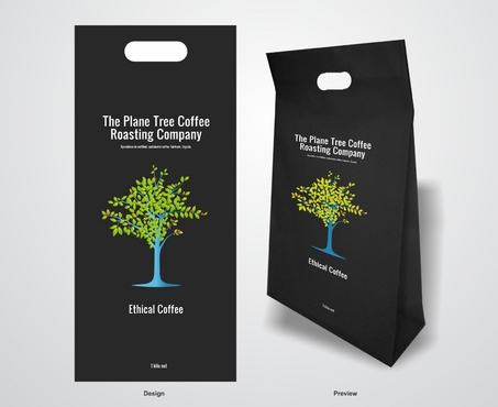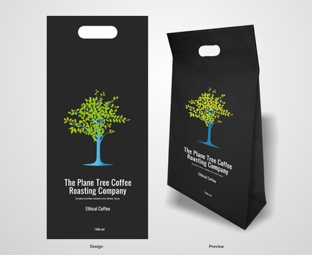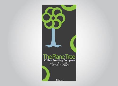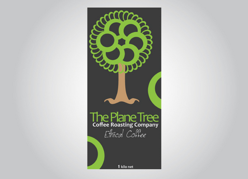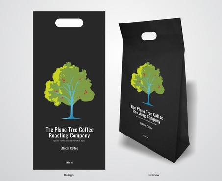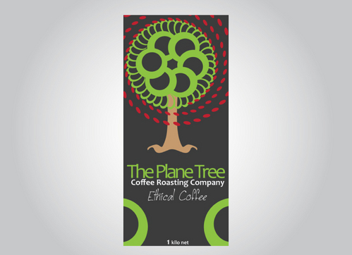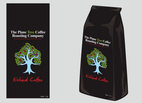 I need a design for a coffee bag 11inches high and 5 inches wide. The company: The Plane Tree Coffee Roasting Company specialices in certified, sustainable coffee- Fairtrade, Organic. The principle image is of a tree. Principle colors are to be black, green and blue (as in the Fairtrade logo) with red representing coffee cherries. The design needs to include the company name, the image and the weight " 1 kilo net'. Preferred format is in Adobe Illustrator.