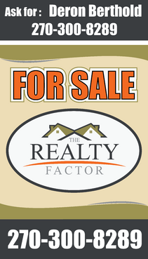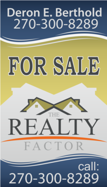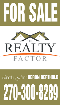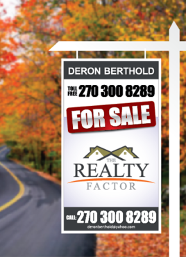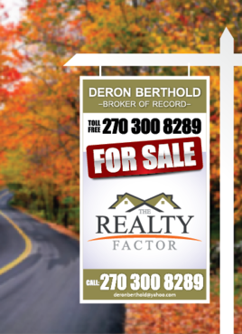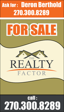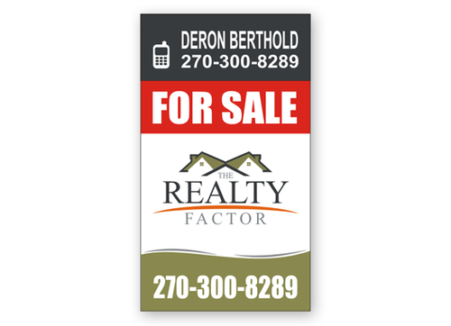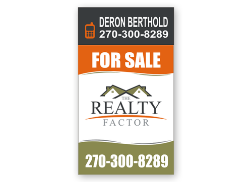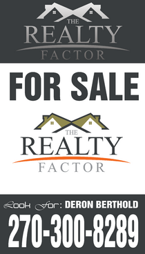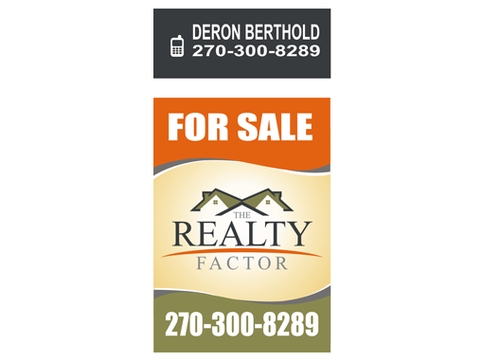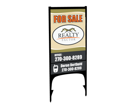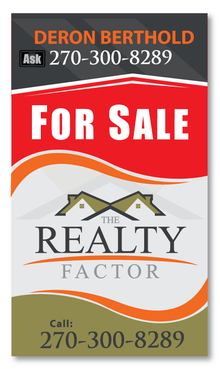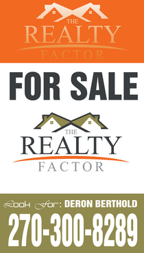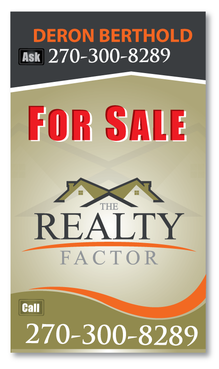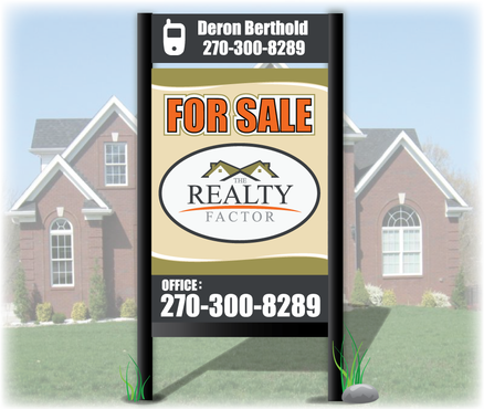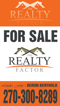 "THE REALTY FACTOR" is a new and upcoming real estate company. Very modern,Very Professional. With the help of Logo Design Guru we now have company logo and stationary. We now need real estate yard signs...... We need a designer to take the company logo and other information and design a very professional, unique, modern yard sign that grabs your attention as you travel past. See attached picture for a normal yard sign. Note: The yard sign has two parts. Part one is an insert for individual name and phone number. Part two is the body of the sign with the words For Sale, logo and phone number. KEEP IN MIND - The sign frame will be forty two inches tall by twenty four inches wide. It will be taller than the normal yard sign. USE THE FOLLOWING INFORMATION ON SIGN: > DERON BERTHOLD > 270-300-8289 > FOR SALE > LOGO - Ai file attached. THANKS FOR THE HELP.... GOOD LUCK.....