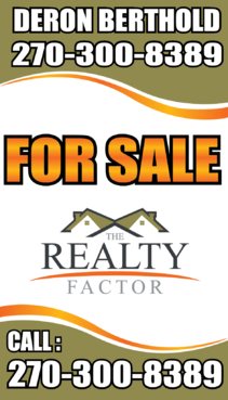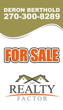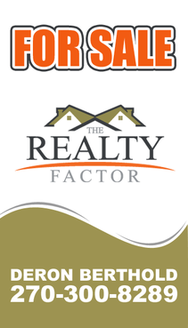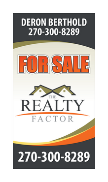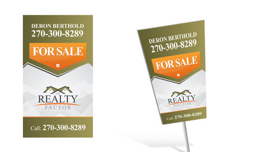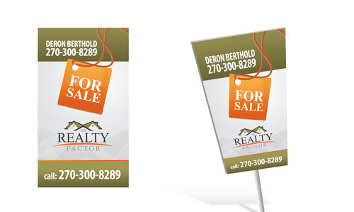 "THE REALTY FACTOR" is a new and upcoming real estate company. Very modern,Very Professional. With the help of Logo Design Guru we now have company logo and stationary. We now need real estate yard signs...... We need a designer to take the company logo and other information and design a very professional, unique, modern yard sign that grabs your attention as you travel past. See attached picture for a normal yard sign. Note: The yard sign has two parts. Part one is an insert for individual name and phone number. Part two is the body of the sign with the words For Sale, logo and phone number. KEEP IN MIND - The sign frame will be forty two inches tall by twenty four inches wide. It will be taller than the normal yard sign. USE THE FOLLOWING INFORMATION ON SIGN: > DERON BERTHOLD > 270-300-8289 > FOR SALE > LOGO - Ai file attached. THANKS FOR THE HELP.... GOOD LUCK.....