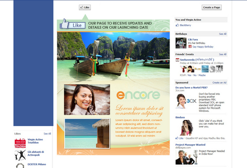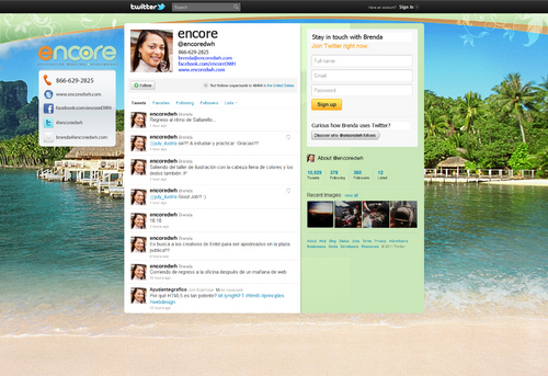 I need a Twitter background with logo, I would like the contact info on the left hand side to the main Twitter page. Phone: 866-629-2825 Website: www.encoredwh.com Facebook: facebook.com/encoreDWH Twitter: @encoredwh Email: brenda@encoredwh.com - - - - - - I would like a facebook landing page introducing the business, asking people to "Like" our page in order to receive updates of the launch date.