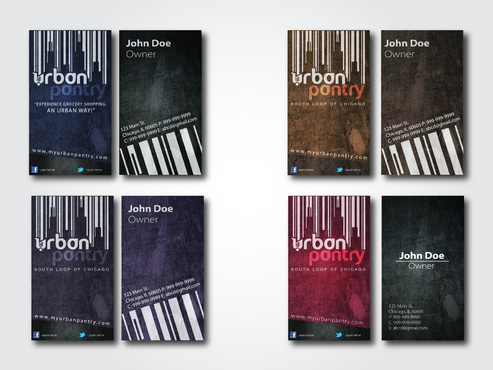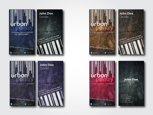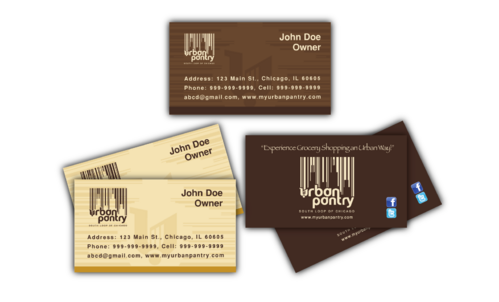 We were very very satisfied during our logo design contest. Lot of creative minds here and that brings me back again for our business cards! Here is a link to our prior project - http://orders.logodesignguru.com/contests/project-urban-pantry-pup We are young and will be setting up in urban area. We would like this factor to reflect in our business cards. We found sample business cards that we like on web - http://naldzgraphics.net/inspirations/60-most-beautiful-and-creative-business-cards-design/ We are still deciding on color scheme so please feel free to use different pallet/scheme while altering business logo. Should include a space for facebook and twitter icon and id as well. Use UPFacebook and UPTwitter as a dummy ids.