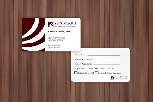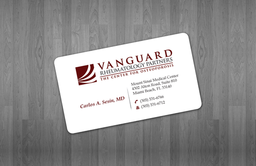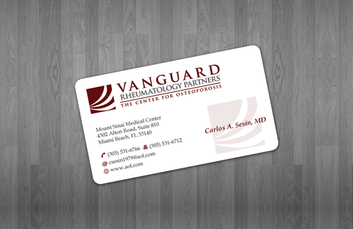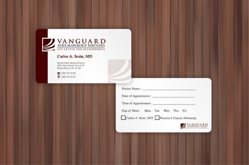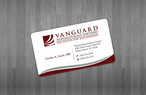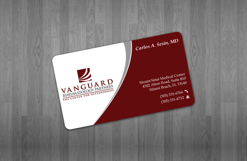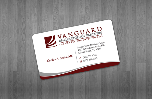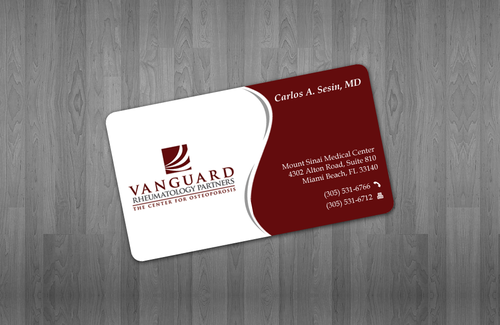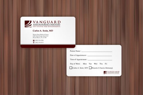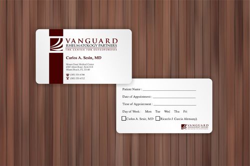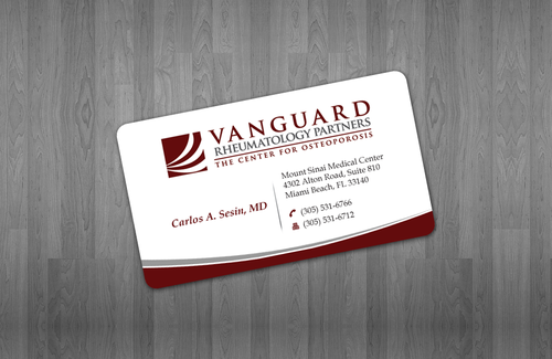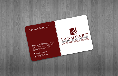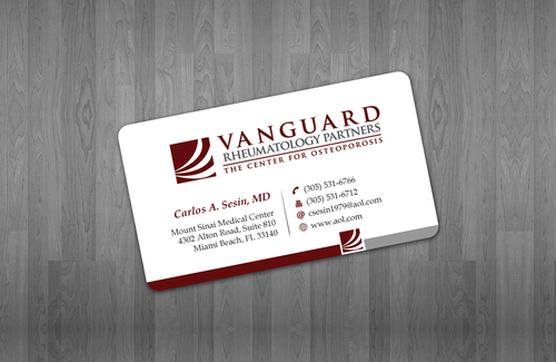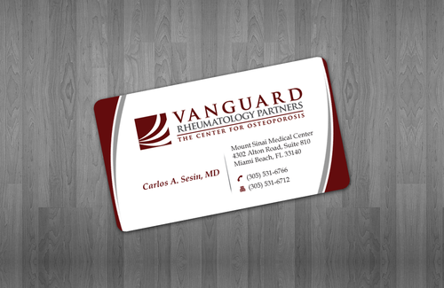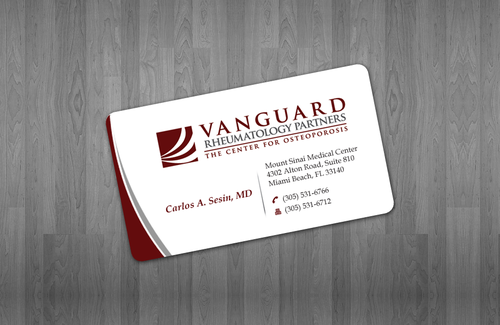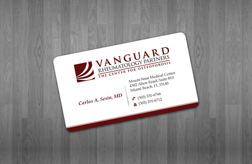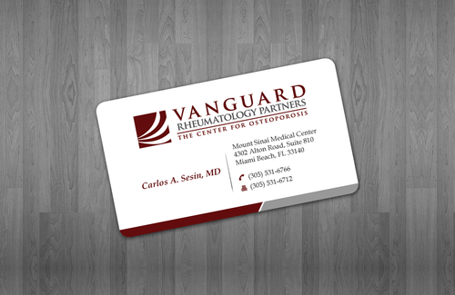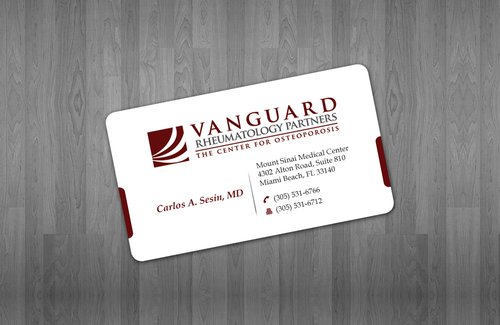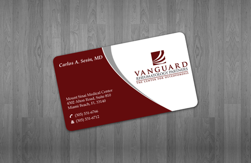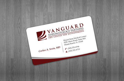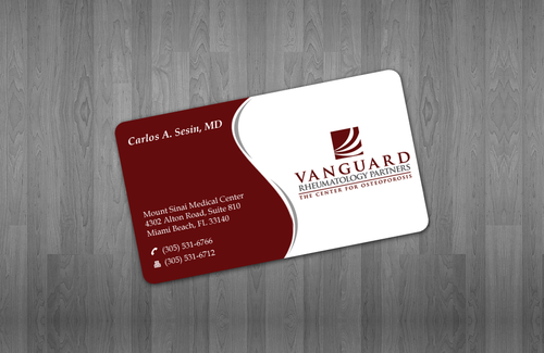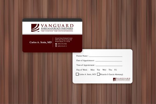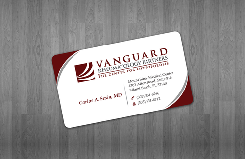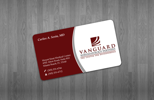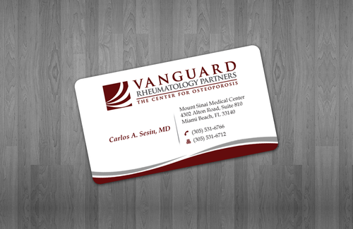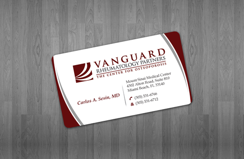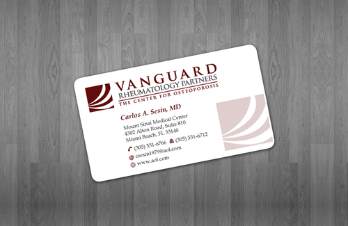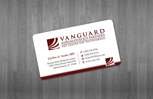 We are presently a group of two rheumatologists. We are expecting a third rheumatologist the summer of 2012. We will need two versions, one that has my name, Carlos A. Sesin, MD, and the other that has my partner's name Ricardo J. Garcia Alemany, MD. We are striving for a modern, clean, professional, corporate look. Please use the logo that we are providing. Will be uploading. Would like to keep colors simple. As per logo, we use dark red and gray; I suppose the text on the card will need to be black or similar. Please do NOT put email on card. We still do not have an "official" email. Will also like to see letterhead and envelope design, as well. With the envelope, we are simply looking for a neat-looking, recognizable return address section.