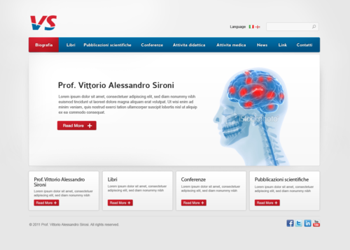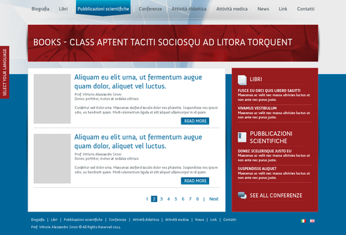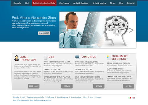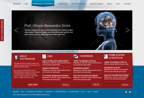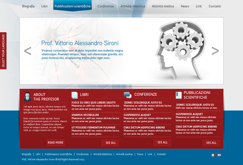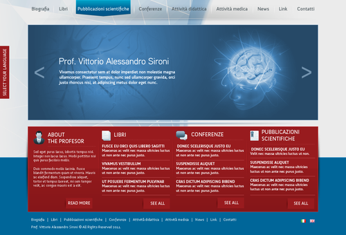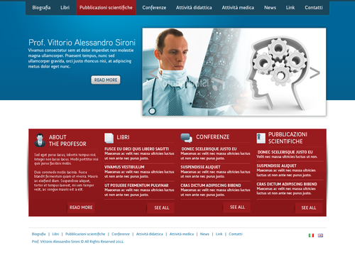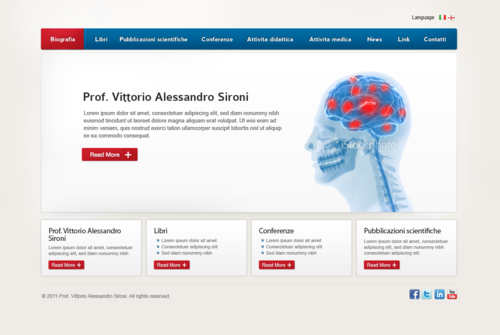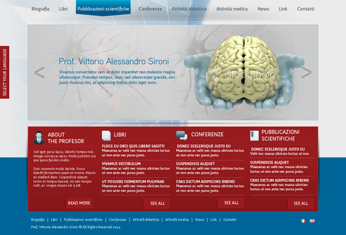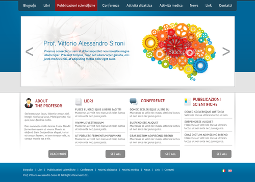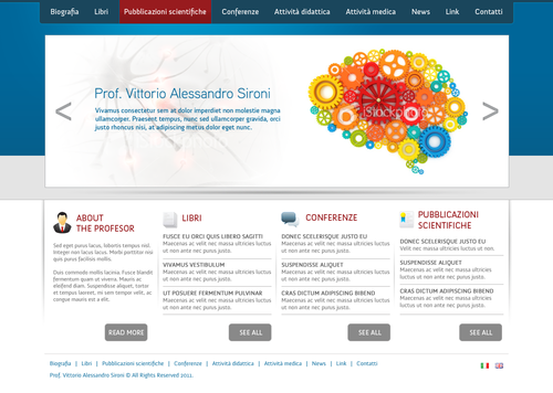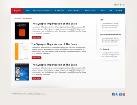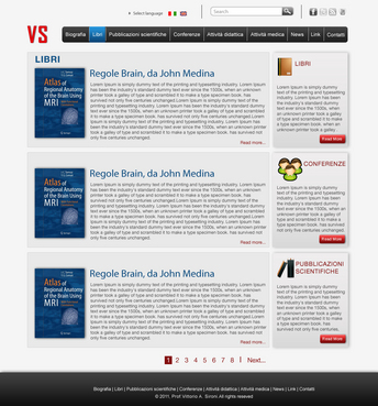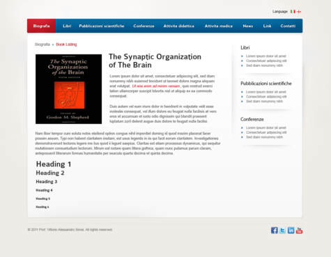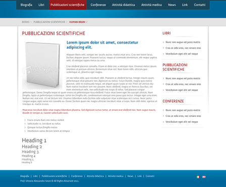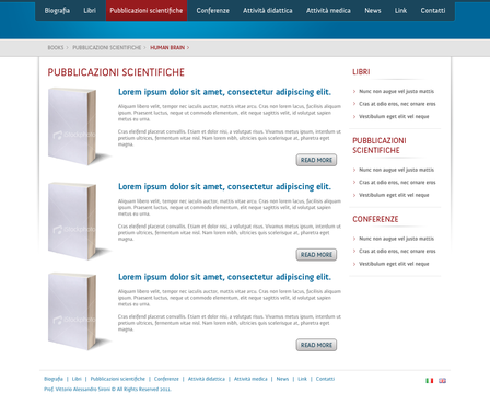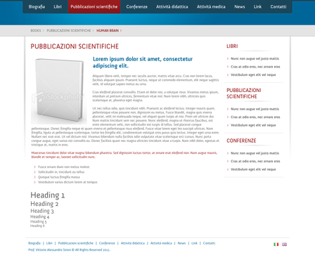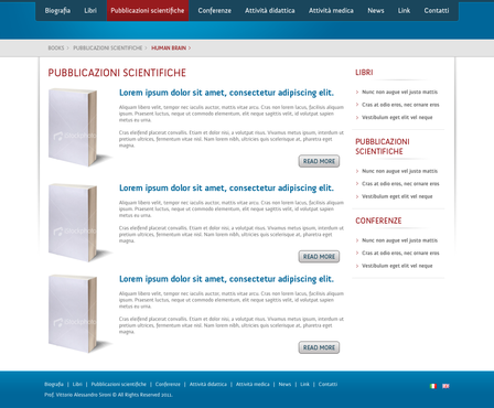 We need the graphic template of: • Homepage • Generic content page (text+image+ eventual document to download) • listing page of books + page with information about the selected book • listing page of conference + page with information about the selected conference • Contact The site must be optimized for 1024X768. For the main menu, it's possibile to use not system font. File must be preferably png (adobe fireworks), otherwise ai (adobe illustrator) or psd (adobe photoshop).