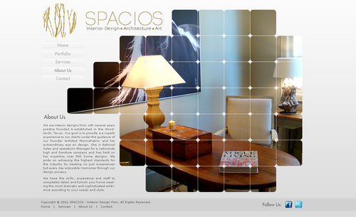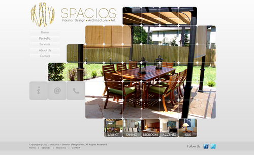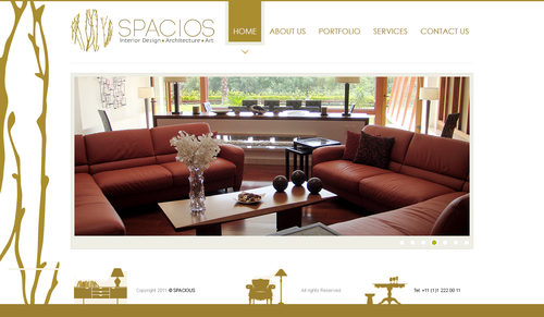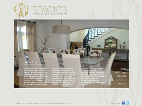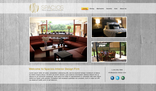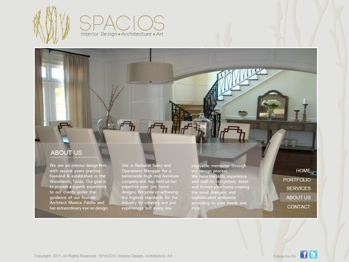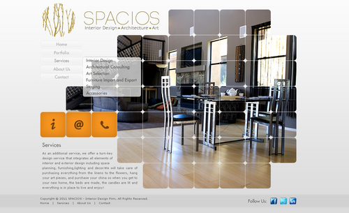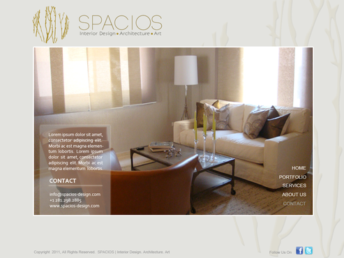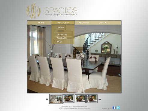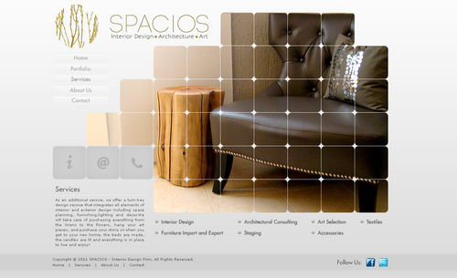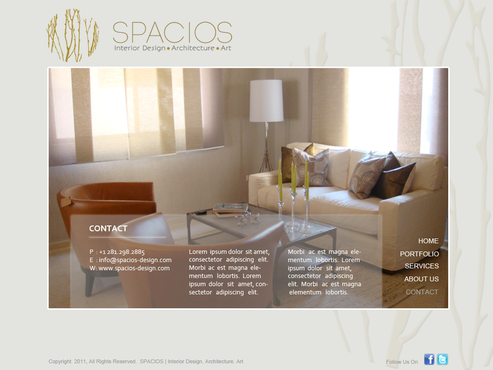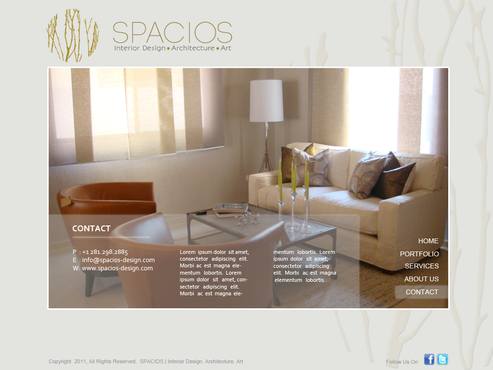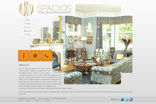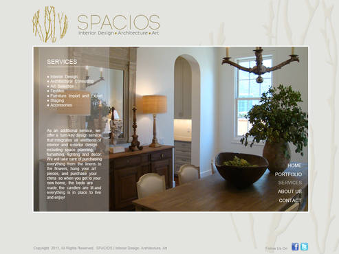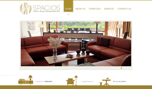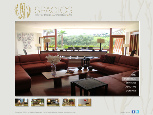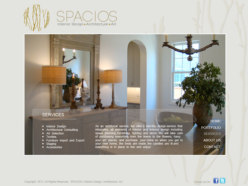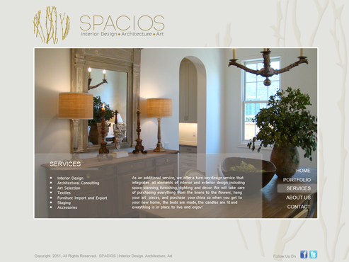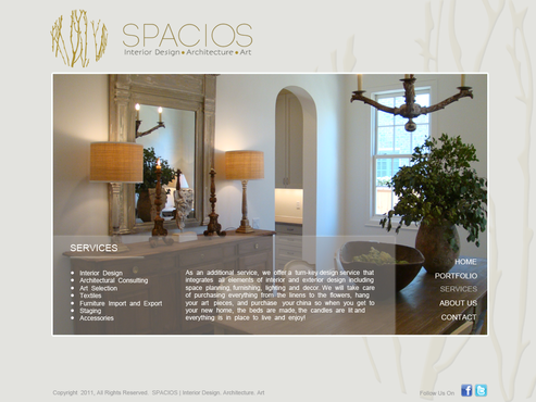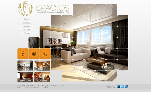 Please use the Fonts from my logo: SPACIOS-Code Light Interior Design,Architecture,Art-Bonveno CF I would like for you to use the accent color on my logo as an special accent only so my logo is not overpowered. I am open to navigation placement but it does not give me that option so I selected what I believe is my personal preference.