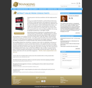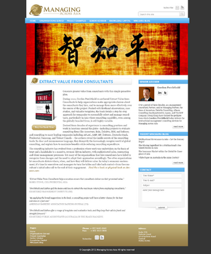 Please design a WordPress web template/site for www.ManagingAcross.Asia (the extension is dot Asia) with the objective that I will be able to maintain it myself afterwards. This website will allow me to decommission two other websites of mine www.RFPCompany.com and www.ExtractValueFromConsultants.com although I will create redirects so that if there is an internet search for RFPCompany, it will land on ManagingAcross.Asia . There are some comments in the outline below about some content that should be extracted from these two sites to be decommissioned. I also maintain a Wordpress blog site www.MNCGuru.com which I either will retain or you are welcome to suggest how I could incorporate it into the ManagingAcross.Asia WordPress site. I will continue to need a blogging capability. Right now, reach me through Gordon@MNCGuru.com and I can email you the files below (photos, book cover) that cannot be captured in this briefing box. The logo for the firm is shown below. I have listed the various formats I have available below - just ask for what you need to leverage the logo design and coloring for the site. I suspect your design will reflect a similar gold/brown tone with Asia/map/journey imagery but that is up to your creativity. The target audience is executives of multinationals or SMEs (or the reality, their direct reports).  Logo is created on adobe illustrator CS5 with os window 7. Editing can be done on any vector editable software like illustrator CS5 onward ,coral draw ,freehand..etc. Web and ms office suite files is ready for use(transparent PNG). Files formats available are: EPS - Ai vector PDF vector jpeg transparent PNG (web and ms office) transparent gif tif vector files(EPS,PDF and AI are fully editable and used for high class print) jpeg file is in high res and used as general print. font file is attached with the set. font used as Managing - TrajanPro-bold Across Asia -TrajanPro-Regular Color info brown - light brown- #CBB477, CMYK (22,25,62,0 ) dark brown - #876D2F, CMYK (41,49,96,21 ) grey- light grey- #999999, CMYK (43,35,35,1 ) dark grey- #666666, CMYK (60,51,51,20 ) black background- black- #000000, CMYK (100,100,100,100 ) Obviously, in the website you can incorporate graphics or pictures (some photos of me below).      Below are content for various pages which should be self-explanatory - use as appropriate. You should have a contact email button on the pages (probably right corner) which would populate Gordon@ManagingAcross.Asia in the user’s email application. HOME PAGE (SERVICES) Academic research has found that Western organizations have failed to perform as well in Asia as in their home region. This finding has significant implications for as Asia returns to its historical role as the primary economic engine of the world, Western organizations will be unable to maintain the growth rates they enjoyed in the era when Western markets were pre-eminent. Our more optimistic scenario assumes that Western organizations have not applied the appropriate strategic and operational approaches in Asia precisely due to the greater economic opportunities that were available during the 20th century within their home region. But Western organizations are now making Asia a strategic priority and have the capability to build and manage highly successful operations across Asia. And Managing Across Asia is there to support them. Managing Across Asia advises board members, CEOs, and their management team at the corporate headquarters, Asia regional office, and local country level with: - Enhancing corporate governance to promote greater success in Asia - Realigning Asia regional office to cost effectively balance among local responsiveness, risk management, knowledge sharing, and regional synergy objectives - Structuring multi-country initiatives/projects at the inception stage so that they build new capabilities while promoting a broader global mindset across Asia regional and country-level operating entities - Developing more productive Asian-Western cross-cultural management teams at the corporate, regional, and particularly, local country level Undertaking strategic and operational assessments of local country operations Managing Across Asia also undertakes strategic research of markets and competitors as well as facilitating strategic management workshops and Asia regional meetings ORGANISATIONS SERVED Since the mid-1980s, Gordon Perchthold has personally served 42 organisations headquartered in Australia, Canada, France, Germany, Netherlands, South Africa, United Kingdom, and the United States delivering more than 150 projects involving the cultures, markets, and/or business operations in Australia, Canada, China, Japan, Korea, Hong Kong, Indonesia, India, Malaysia, Mexico, Philippines, South Africa, Taiwan, Thailand, Singapore, United States, and Vietnam. These organisations include: AEGON Aetna Allianz AIG/AIA American Nuclear Insurers AMP ANZ Bank AXA Bankers Trust Bank of Nova Scotia Canadian Imperial Bank of Commerce Canadian Surety CIL Commonwealth Bank of Australia Daimler Chrysler Mitsubishi Fuso Deutsche Bank The Doctors’ Company Dominion General Insurance Company of Canada Gibraltar Life Hartford Life ING Manulife Financial Mass Mutual MetLife National Australia Bank New York Life Old Mutual Ontario Mutual Insurance Group Perth Building Society PruCanada Prudential plc Prudential Financial Prudential Healthcare Group Richard Ivey School of Business / Asia Royal Trust Samsung Life SK Life State Bank of New South Wales State Bank of South Australia State Bank of Victoria Sun Life Financial Telesat Canada PROJECT EXAMPLES Restructure Asia Regional Office: This Fortune 200 company recognised that its Asia regional office simply emerged over the years defined by the preferences of its regional CEO or in response to critical events. Without an architecture, Asia Regional Office risked evolving into a costly bureaucracy that added more cost than value to the organisation. The