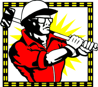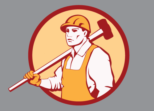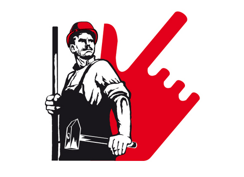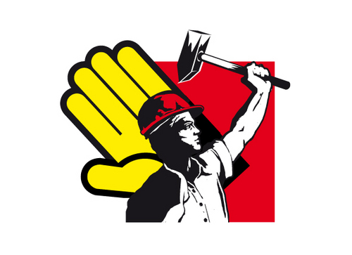 Workman Glove Co. go to www.workmanglove.com to view logo. Looking for a character in the style of russian worker poster. stylized worker with hammer or saw in hand, hardhat, overalls.. Denote strength.