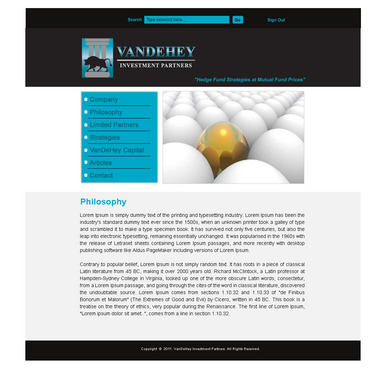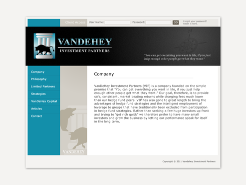 The site doesn't need to be terribly complex nor work as a stand-alone source for sales. It is mainly a source for further information for people I have talked to about the fund personally. It should also be a place for current clients to check on performance of their portfolios. Of the websites listed above: I like JP Morgan's appearance I like Och-Ziff's layout and simplicity blackrock I like in general I also made a mock up of how i saw the site, which I'll upload once the contest is up and running.